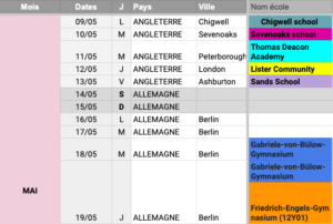 We also had to combine school availabilities and our own planning, especially our allowed time in each country. Therefore, it was quite challenging on the logistical front, as shown on our planning: